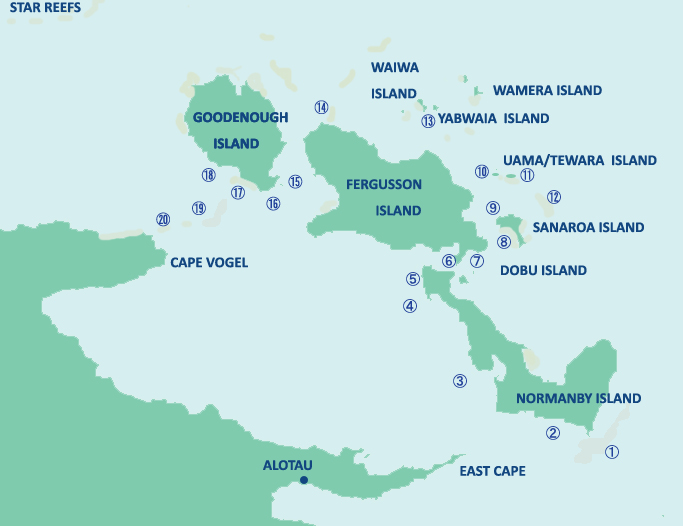 ミルンベイの北東部のソロモン海に位置する島々で、北からグッドイナフ島、ファーガソン島、ノーマンビィ島の3つの島をさします。これらの島の周りにアンフレット島、サナロア島、ドブ島など多くの小島が点在し、どこも魚影が濃く、信じられないくらい多様な生物が生息するダイビングサイトが無数に存在します。