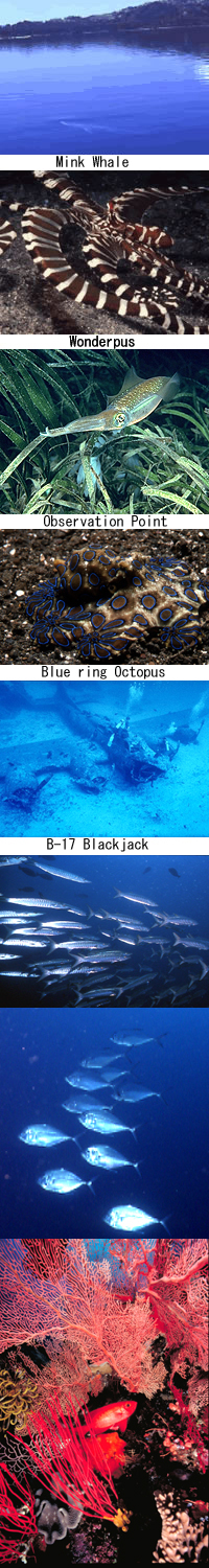 海藻や海草に覆われた砂地の海底で、一部は水面近くから水深35mまでスロープ状に落ち込み、窪地には枯れ葉や枝が堆積しています。浅瀬ではヘコアユが見られ、ヒメツバメウオが泳ぎ回ります。砂地のウミユリにはニシキフウライウオが隠れていて、セミホウボウやモンダルマガレイ、共生するハゼとエビの姿も観察できます。また珍しいシマダコやハナイカも撮影されています。ヒメオニオコゼやカサゴの仲間も数多く見られます。
