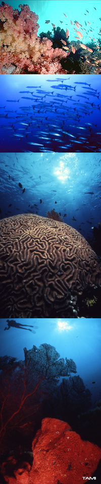 サラモア半島(SALAMAUA PENINSULA)北端に位置するポイントのひとつです。深場から立ち上がったリーフで、水深は27mあります。リーフは色とりどりのソフトコーラルやミズガメカイメン、ブラックコーラルに彩られています。潮通しがよく、イソマグロやサワラなどの回遊魚のほか、たくさんのリーフフィッシュが見られます。