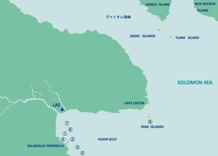 ニューギニア本島のソロモン海に面したフオン半島の南のフオン湾周辺のエリアで、南にはトゥフィ、北にはヴァイタル海峡があります。ポイントは大きく分けてラエの港の近くと沖合いのタミ諸島に分かれています。ラエは、マーカム川の河口に位置する街で、ハイランド地方の観光拠点として栄えてきました。ラエの街から南へ約40kmにある南北に細長いのサラモア半島周辺には多くのダイビングポイントが点在し、港の周辺には無数の沈船が眠っています。少し沖合いに出ると多くの隠れ根があり、ここではサメ、イソマグロ、スパニッシュマクラル、そしてバラクーダやアジの群れ等、無数の回遊魚と遭遇できます。