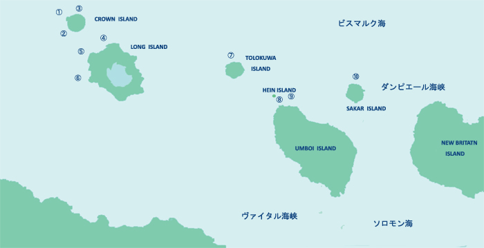 本島とニューブリテン島の間には流れの速いヴァイタル海峡があります。その中央にある島がクラウン等とロング島です。マダンから8時間ほどのクルーズでアクセスします。どちらも大変潮通しの良い島で、バラクーダ、ギンガメ、ツムブリの群れが常連です。クラウン島は半径8Km程の丸い王冠のような形の島で周囲をフリンジングリーフに囲まれています。その西側のロング島は半径20kmほどの大きな火山島で中央にはウイズダム湖という大きな火山湖があります。