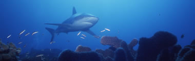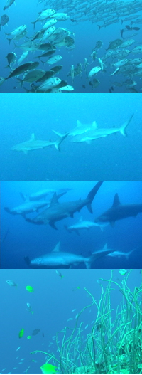 トロキワ島の北側のバリアリーフの外側のサイト。サンゴにびっしり覆われたウォールの深場を覗くと巨大なグレートハンマーヘッドの群れ(右写真)が回遊していることがあります。